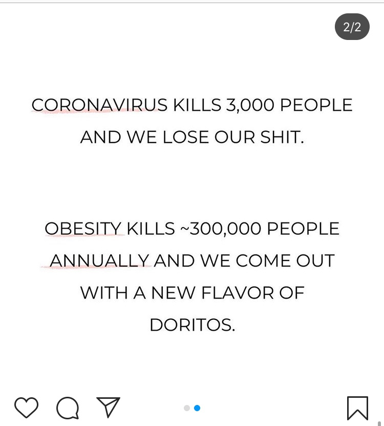 Forget that she was using the current coronavirus outbreak to promote her healthy eating plan (which in itself is a pretty weird way to advertise something) – she came after the diabetes community with this post. Now, I’ll never know what her true intent was, and I don’t care if Autumn was talking about a specific type of diabetes here. That doesn’t make a damn difference. The problem with this post is that she is perpetuating diabetes stigma and alluding to a myth that an individual has control over whether or not they get diabetes. Posts like this are the reason why there is so much confusion and misunderstanding when it comes to all types of diabetes, and I think she should be ashamed of herself for putting this on her profile.